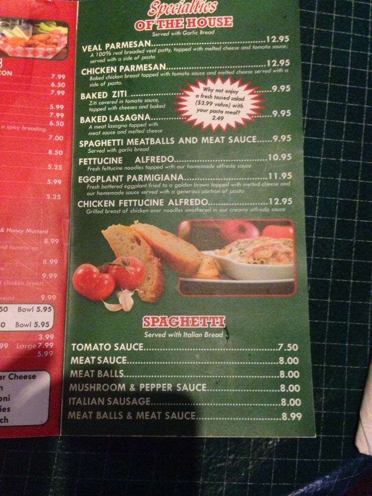 100% real breaded veal patty, topped with melted cheese and tomato sauce; served with side of spaghetti